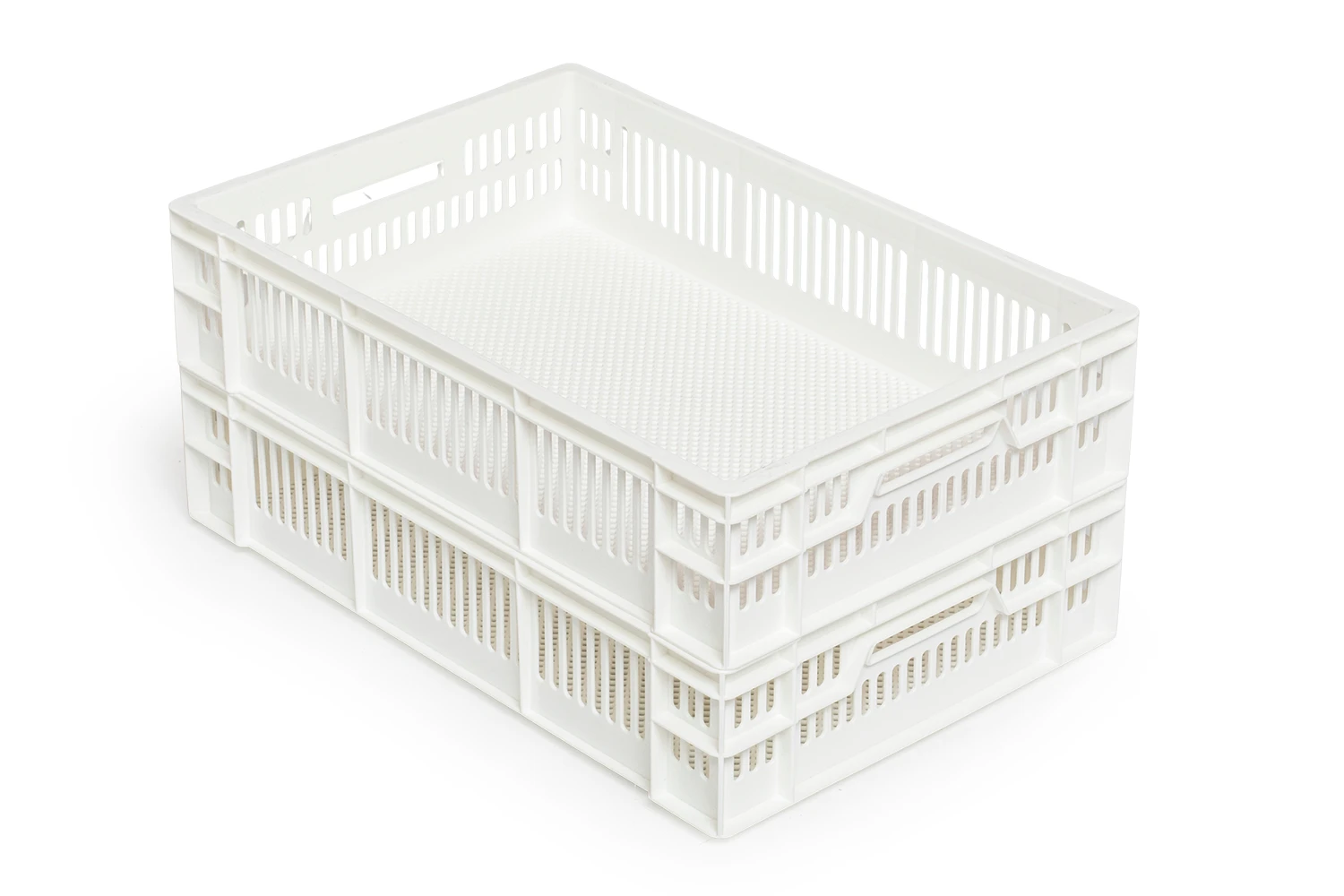 This box is developed in order to satisfy best resistance during product lifetime. Strenght of the bottom has been improved in order to obtain more sturdiness. The design of the stacking system is studied to obtain optimal stability during transport